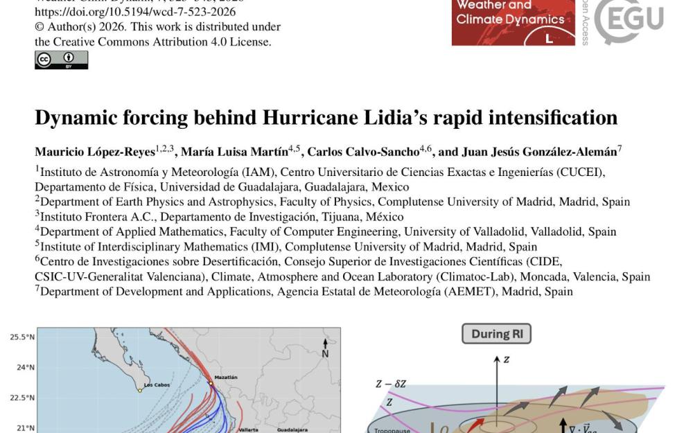 El estudio titulado "Dynamic forcing behind Hurricane Lidia's rapid intensification", analiza los mecanismos dinámicos que provocaron la intensificación extrema del Huracán Lidia en 2023 antes de tocar tierra en Jalisco. Este trabajo, realizado en colaboración con la Universidad Complutense de Madrid, el Consejo Superior de Investigaciones Científicas (CSIC) y la Agencia Estatal de Meteorología (AEMET).